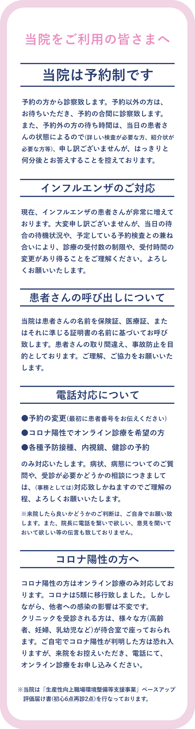 当医院は、身近にあって、何でも相談にのってくれる 総合的な医療プライマリーケアを目指しています。 お子様からご高齢の方まで、 世代をまたいだ方々のホームドクターとして、 みなさまの生活に寄り添います。